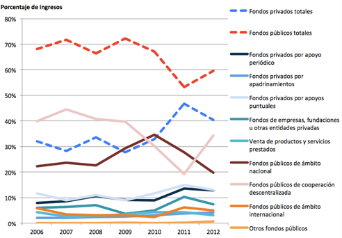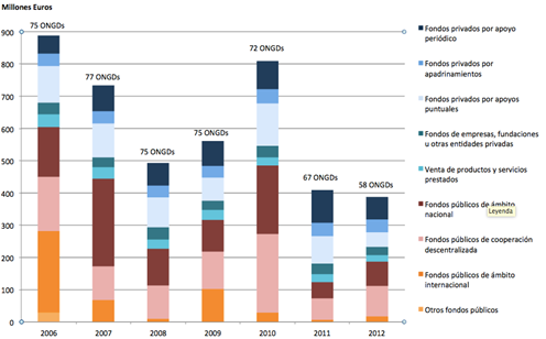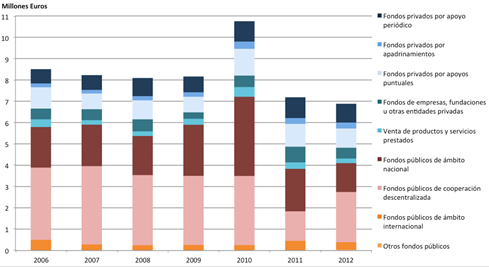 Todo ello pone de manifiesto la importancia de analizar la estructura de ingresos de las ENL, centrándonos en nuestro caso en estudiar cómo esta ha sido afectada por una crisis que, como veremos a continuación, ha golpeado duramente al subsector examinado en este estudio, el de la cooperación internacional para el desarrollo.
