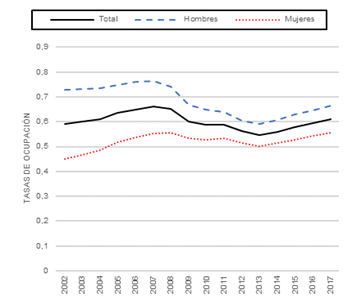 Sin duda, la situación económica que atraviesa España a raíz de la crisis ha provocado un deterioro en el plano económico, político y social. Una de las consecuencias más graves derivadas de este fenómeno ha sido el aumento del desempleo, que según los datos recogidos en este y otros estudios, ha afectado más al colectivo masculino. Las tasas de ocupación femeninas se han mantenido más estables durante la crisis, pero esto no significa que la situación laboral de la mujer sea mejor. De hecho, ese mantenimiento del empleo femenino se debe a que las mujeres poseen condiciones laborales más precarias y salarios más bajos.