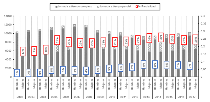 Según datos del 2017, entre las razones que aducen las mujeres para trabajar a tiempo parcial predomina el no haber podido encontrar un trabajo a tiempo completo (56%) y estar al cuidado de niños/as o adultos/as enfermos/as, incapacitados/as o mayores (12%). En cambio, entre los hombres este último motivo solo representa un 2% del total, siendo para ellos la razón principal el no haber podido encontrar un trabajo a tiempo completo (63%) y seguir cursos de enseñanza o formación (13%).
