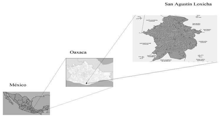 El estudio se realizó en el municipio de San Agustín Loxicha, perteneciente al Distrito de Pochutla, en el estado de Oaxaca. Esta entidad municipal comprende setenta y cuatro comunidades con índice de marginación muy alto (CONAPO, 2010) y se sitúa a 1.820[6] msnm favoreciendo cultivos de altura como el café (Figura 1), con recopilación de información en el periodo de diciembre de 2015 y septiembre de 2016.