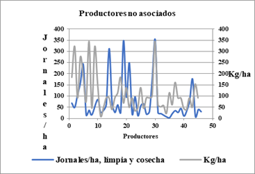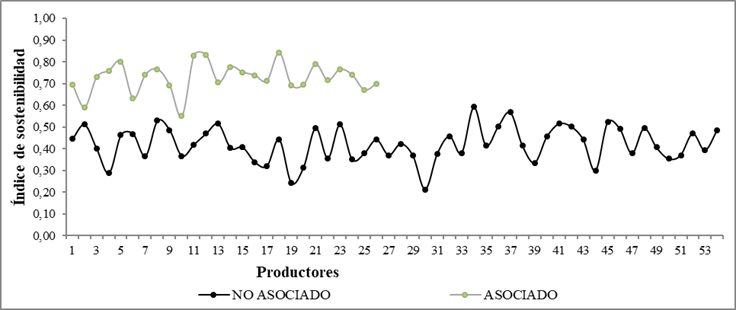 Finalmente, se graficó el índice de sostenibilidad obtenido para cada productor, donde se observa que el sistema de producción de asociados muestra mayor sostenibilidad (Figura 7).