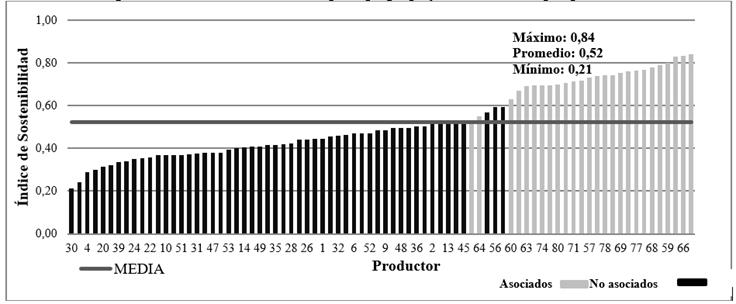 La media general de todo el sistema, sin importar si estaban asociados o no, fue de 0,52, que lo clasifica como regularmente sostenible. Sin embargo, al separar los grupos, el sistema de agremiados presenta mayor sostenibilidad (0,73), debido a las acciones desempeñadas por la cooperativa; mientras, que, los no agremiados alcanzaron únicamente un promedio de 0,43, que clasifica al sistema como regularmente sostenible, con un 88,9% de productores por debajo de la media general (0,52) (Figura 6).