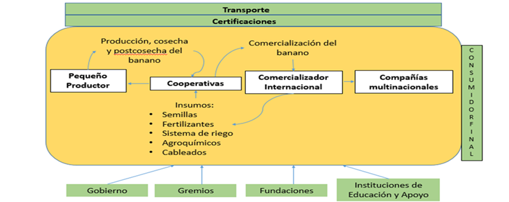 La primera de las características identificadas es la vinculación del pequeño productor en alguna actividad de la cadena de valor del producto.  En el caso de las cooperativas bananeras del Magdalena, se estableció que la cadena de valor está conformada por los siguientes actores: i) Productores asociados en cooperativas; ii) Comercializadoras; iii) Transportadores; iv) Importadores (Compañías Multinacionales). Además, se da la participación de otras organizaciones o instituciones que intervienen con los diferentes actores, como los entes certificadores, las fundaciones y asociaciones y las instituciones de educación y apoyo.