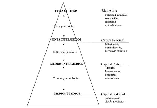 En un primer nivel se encuentran los medios últimos o capital natural, que incluye los elementos presentes originariamente en el planeta, y que sirven de sustento a la actividad económica. Sobre éstos actúa la ciencia y la tecnología, transformándolos en medios intermedios o capital físico, segundo nivel de la pirámide. Dicho nivel es el que determina la capacidad productiva de la economía, conteniendo los inputs económicos tradicionales que, si bien necesarios, no son suficientes para garantizar el desarrollo humano. La valoración, distribución y gestión de tales factores de producción, a través de la política económica, permite alcanzar el tercer nivel, el de los fines intermedios, outputs o bienes económicos -salud, conocimiento, bienes de consumo, transporte, comunicación-. Su posesión tampoco garantiza la satisfacción humana, al no ser fines en sí mismos. Para alcanzar el fin último, o bienestar humano, es preciso la intervención de la ética, religión o filosofía, puesto que es la que permite entender cómo lograr un estado de plenitud o armonía a través de los bienes económicos.
