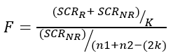 Es importante señalar que por cada una de las seis bases de datos, se realizaron las tres regresiones lineales de acuerdo con el procedimiento descrito y que tienen la forma de la Ecuación 1. Una vez realizadas las regresiones lineales, se estimaron las Sumas de Cuadrados Residuales (SCR) de cada una de las tres regresiones. Las SCR de las dos regresiones que están separadas, se suman para crear la SCR no restringida  como se muestra en la Ecuación 2.