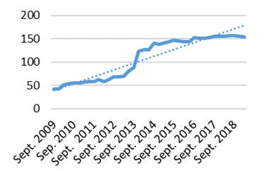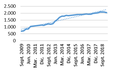 De acuerdo con la metodología mostrada en la sección anterior, primero se mostrarán las seis bases de datos obtenidas. En la Figura 1, se muestran las dos bases de datos que describen el comportamiento de las Sociedades Cooperativas de Ahorro y Préstamo (SOCAPS) de México y que corresponden al número de sociedades y al número de sucursales. Estas abarcan del periodo de septiembre de 2009 a marzo de 2019, en la misma figura se muestra la línea de tendencia de las dos bases de datos.