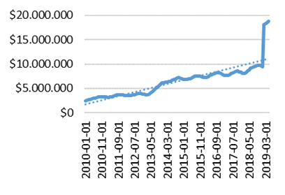 Banco de México (BANXICO) Financiamiento e información financiera de intermediarios financieros, Banca Comercial, Cartera vigente otorgada al sector privado no bancario (metodología 2018), Banca comercial, Cartera de crédito vigente total al sector privado 1/, Saldos nominales en millones de pesos, B. Cartera vigente total por destino del crédito, B.1 Consumo. México. Fecha de consulta: 6 de junio de 2019. Extraído de http://www.banxico.org.mx/SieInternet/consultarDirectorioInternetAction.do?sector=19&idCuadro=CF835&accion=consultarCuadro&locale=es.