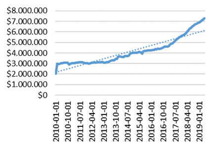 En la Figura 2, se aprecia que los créditos emitidos por las SOCAPS de México han crecido. Lo anterior además de observarse, se basa en la línea de tendencia de las cuatro bases de datos, las cuales, tienen pendiente positiva lo que señala han tenido una tendencia creciente.