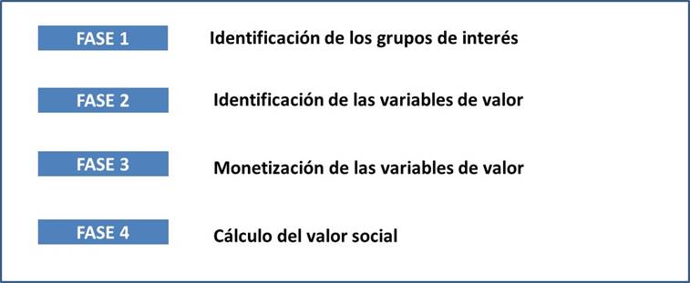 El VSI calculado se compone del valor social generado a través de la actividad económica o mercantil - captado por indicadores de contabilidad - y el valor social específico que la organización genera para sus diversos grupos de interés mediante relaciones ajenas a las transacciones de mercado. Para determinar el valor social específico o valor de no mercado se combina un análisis cualitativo y cuantitativo, y se siguen básicamente las cuatro fases mostradas en la Figura 2.
